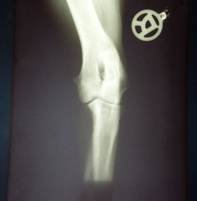 Ideal would be if the outer lateral edge of the olecranon fit’s the outer lateral upper arm rim (Humerusrand). The joint should be lay down reasonably in the middle of the x-ray cassettes (x-ray machine’s central ray). X-Ray without screen, that means the cassette will lay down on the table. It is recommended that the cassette size is 13 x 18 cm.