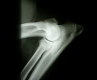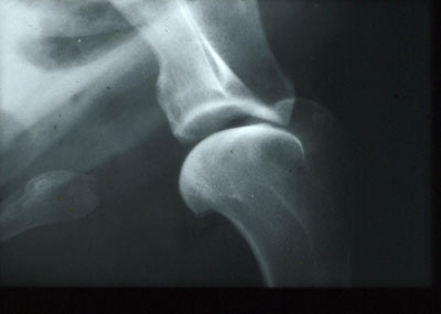 The joint schould be here also in the x-ray machine’s central ray. The x-raying leg is laying on the table and will be pulled in the front (kranial) and the upper leg will be pulled down (caudal). The head and the neck will be bent in the direction dorsal of the back. The joint space should be completely visible (the caudale proportion of the head of the humerus must be visible). X-Ray with screen, that means the cassette will be under the table. (The edge of the humerus must be clearly visible) It is recommended that the cassette size is 18 x 24 cm. A correct exposure is necessary for all pictures.