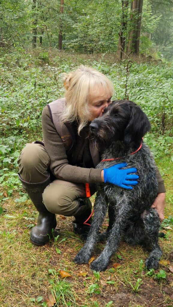 Beschreibung des Hundes: Der Hund ist ruhig, freundlich und ausgeglichen im Wesen. Er ist sehr kinderlieb, sozialverträglich und akzeptiert andere Hunde problemlos. Der Rüde steht in ständigem jagdlichem Einsatz und verfügt über eine sehr große jagdliche Passion. In der Arbeit zeigt er sich scharf, entschlossen und zuverlässig. Er bewährt sich hervorragend bei der Jagd auf Hasen, Fasane und Enten. Besonders hervorzuheben sind seine sehr guten Leistungen bei der Schweißarbeit sowie seine große Freude und Sicherheit bei der Wasserarbeit und im Stöbern. Der Hund arbeitet konzentriert, ausdauernd und mit hoher Einsatzbereitschaft. Er ist sowohl das Leben im Haus als auch im Zwinger gewohnt, ist stubenrein und zeigt sich im Alltag angenehm und ruhig. Durch sein ausgeglichenes Wesen, seine Arbeitsfreude und seine jagdliche Schärfe ist er ein zuverlässiger Jagdbegleiter und zugleich ein angenehmer Familienhund.