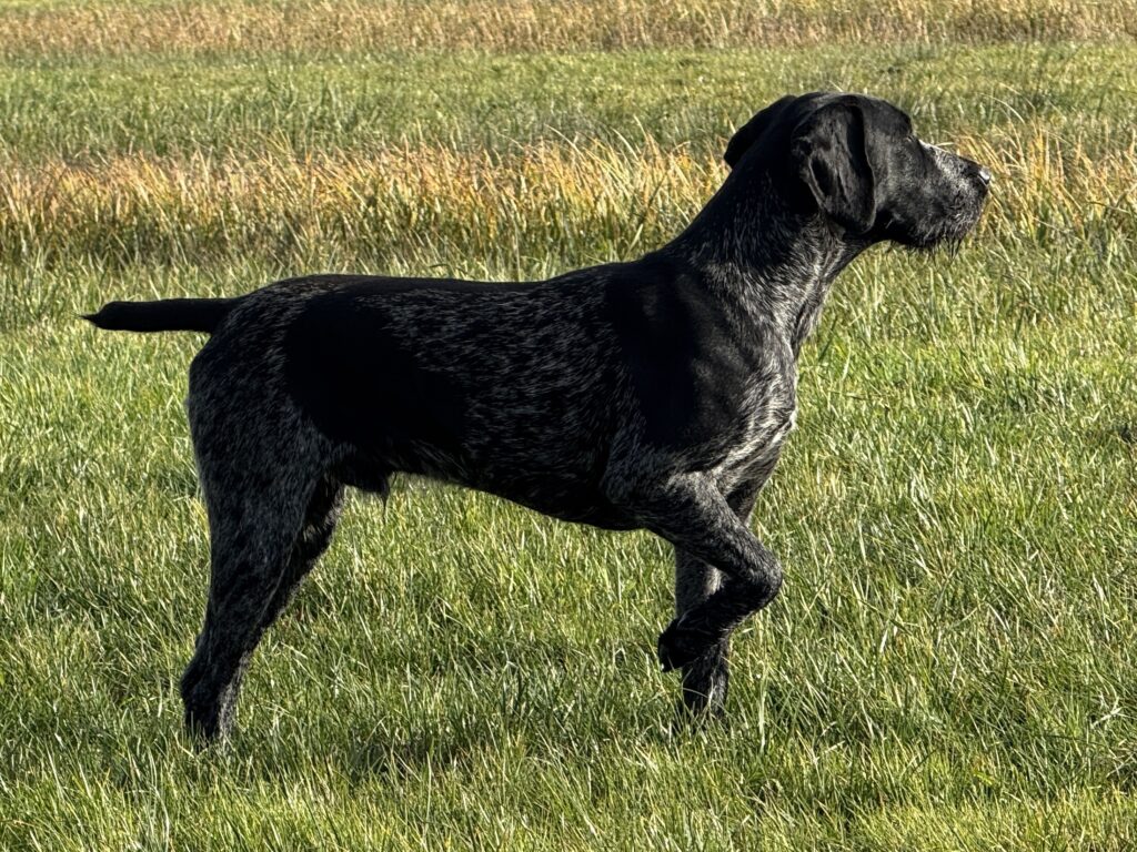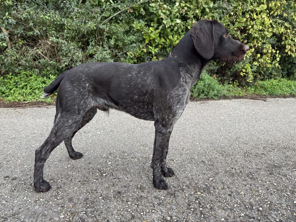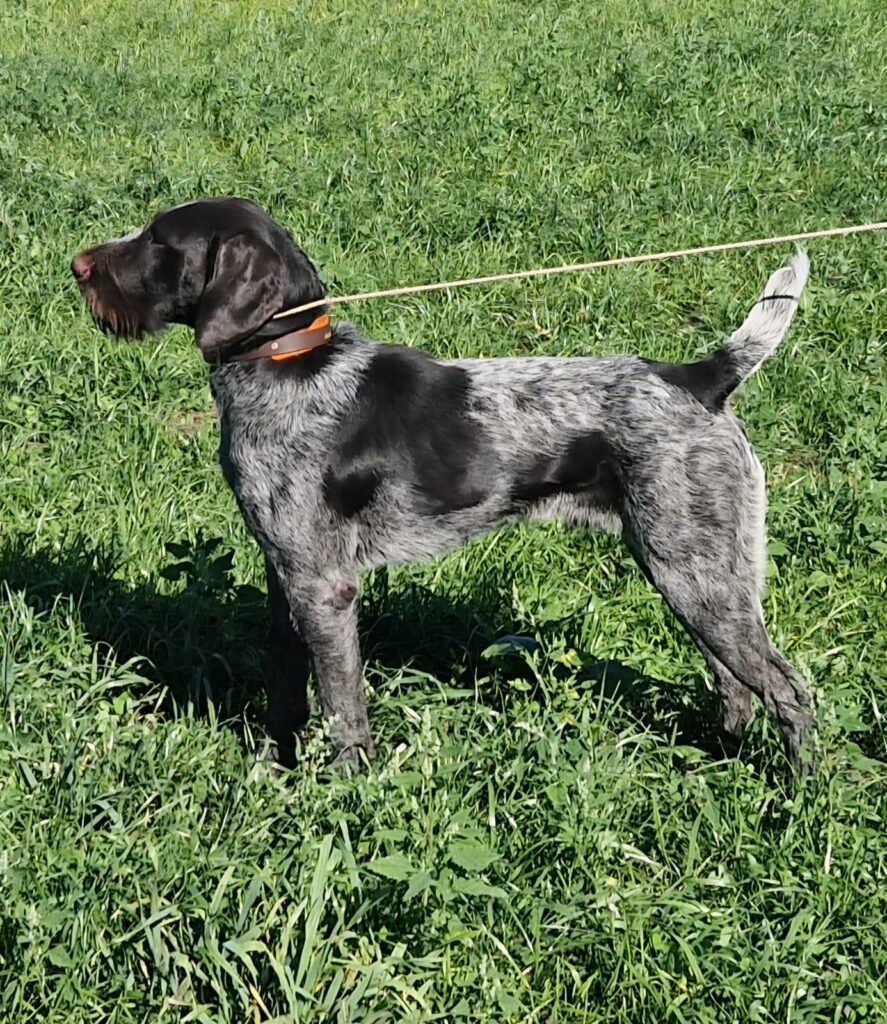 Beschreibung des Hundes: Deutsch-Drahthaar-Rüde „Ice“ – leistungsstark, charakterfest und zuverlässig! Ice ist ein eindrucksvoller Deutsch-Drahthaar-Rüde des großen Schlages mit einem Stockmaß von 66 cm. Er überzeugt nicht nur durch seine kräftige Erscheinung, sondern vor allem durch seine hervorragenden jagdlichen Eigenschaften und sein ausgeglichenes Wesen. Dieser Rüde ist schussfest im Feld wie auch am Wasser und arbeitet mit einer bemerkenswerten Ruhe, Umsicht und Selbstsicherheit. Sein freundliches und soziales Verhalten gegenüber Artgenossen sowie seine Führerbezogenheit und Gehorsam machen ihn zu einem äußerst angenehmen Begleiter – sowohl bei der Jagd als auch im Alltag. Die Prüfungssaison 2025 konnte Ice mit großartigen Ergebnissen abschließen: Alle Prüfungsfächer wurden mit einem „Sehr Gut“ bewertet. Besonders hervorzuheben ist seine hervorragende Vorstehleistung, die durchgehend mit den höchsten Noten ausgezeichnet wurde. Seine Arbeitsfreude und sein unermüdlicher Einsatz führten auch im Feld und Wasser zu besten Bewertungen. Bereits im Welpenalter wurde Ice kontrolliert am Schwarzwild im Gatter eingearbeitet. Dort zeigt er sich umsichtig, scharf genug, aber keineswegs überstürzt oder scheu – eine ideale Kombination für den praktischen Jagdeinsatz. Ice lebt im Haus mit engem Familienanschluss und kennt den Alltag im häuslichen Umfeld. Aktuell befindet er sich in Vorbereitung auf die VGP im Oktober 2025. Eine Abgabe ist jedoch auch vor diesem Termin an einen erfahrenen Hundeführer möglich.