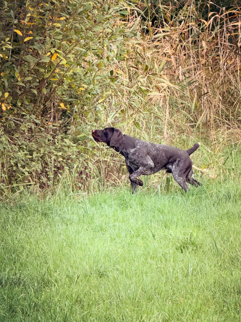 Beschreibung des Hundes: Der Rüde Pegasus, genannt Panther stammt aus jagdlicher Leistungszucht und ist aus Nora vom Haus Heßling und Lump vom Hechtsgraben gezogen. Panther arbeitet sehr passioniert bei gleichzeitig sehr guter Führigkeit. Er überzeugt durch ausgeprägten Finderwillen im Feld sowie Wasser. Er ist solide ausgebildet, zeigt sicheres Vorstehen und es macht Freude, mit ihm auf Niederwildjagd zu gehen. Er ist arbeitsfreudig, zeigt eine fleißige Suche und bringt zuverlässig. Panther hat ein ausgeglichenes, ruhiges Wesen, auch im Haus und ist Auto fahren sowie den Umgang mit anderen Hunden gewohnt. Panther zeichnet sich durch seine Führigkeit, seine Bindung und sein freundlches Wesen aus und ist ein idealer Begleiter im Revier wie in der Familie.