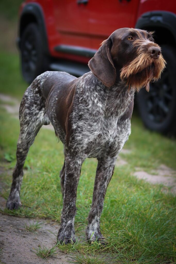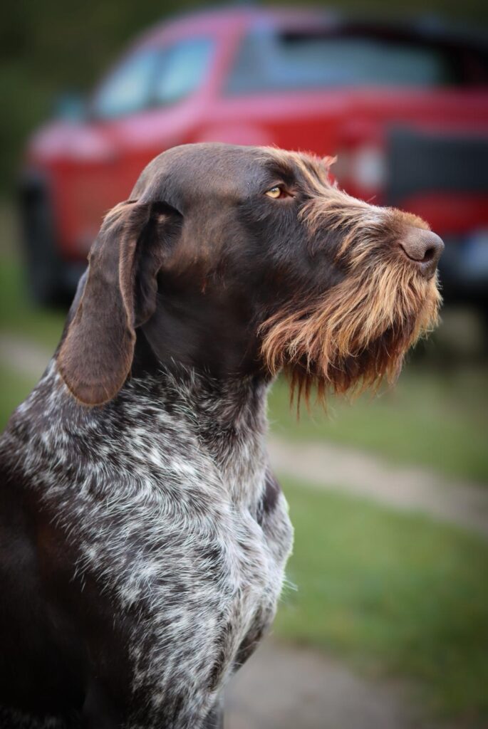 Beschreibung des Hundes: Eine dem Standard entsprechende Braunschimmel Hündin mit sehr schönem Bart und dichtem kurzem Haar. Zwinger, Haus, Auto und Kinder gewöhnt. Auf Niederwild voll bejagt. Aus persönlichen und gesundheitlichen Gründen abzugeben.