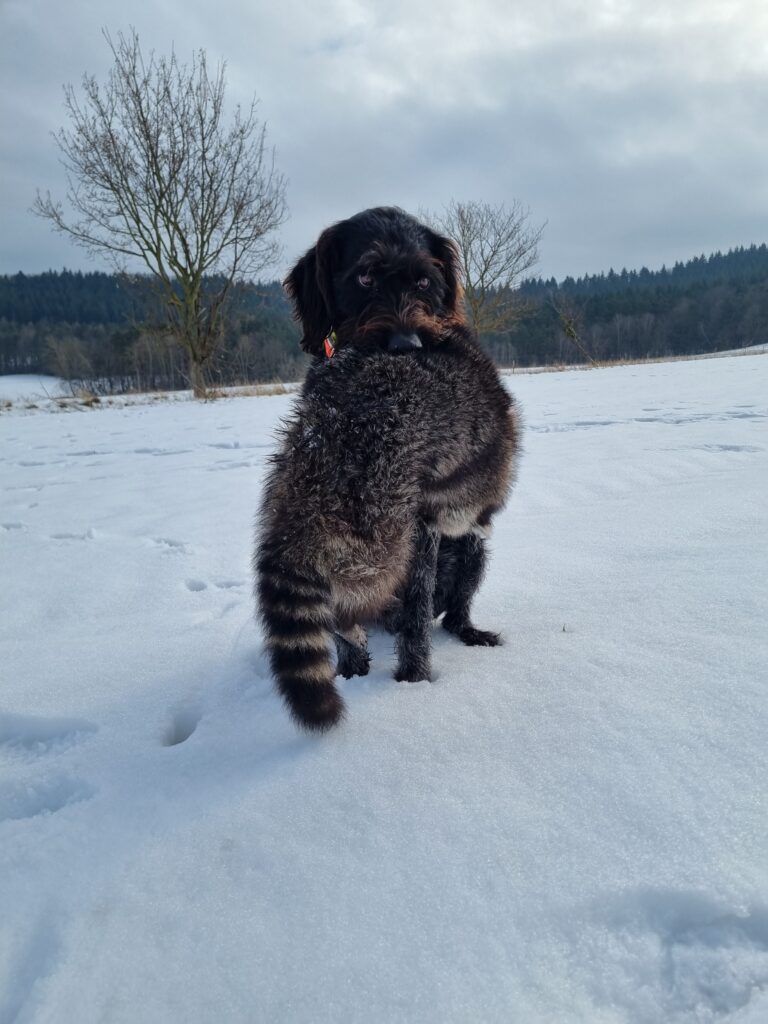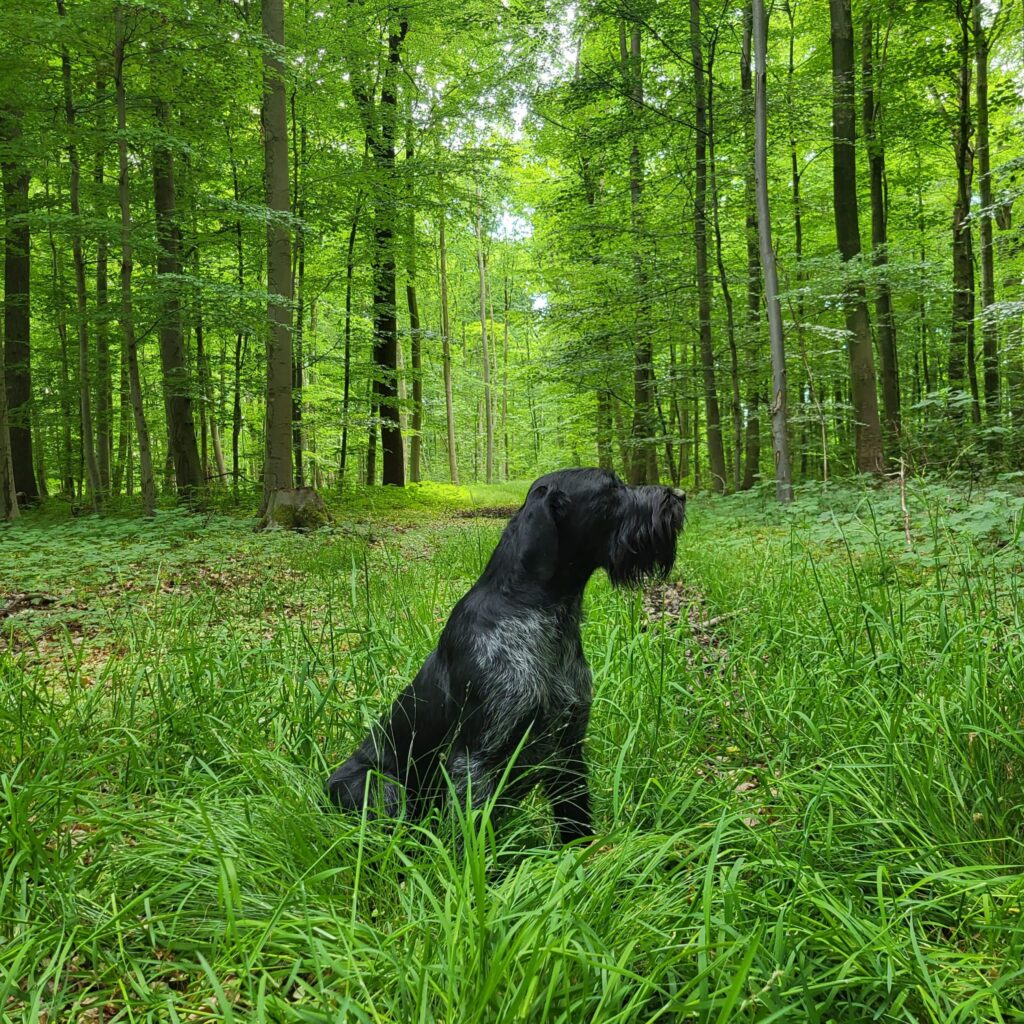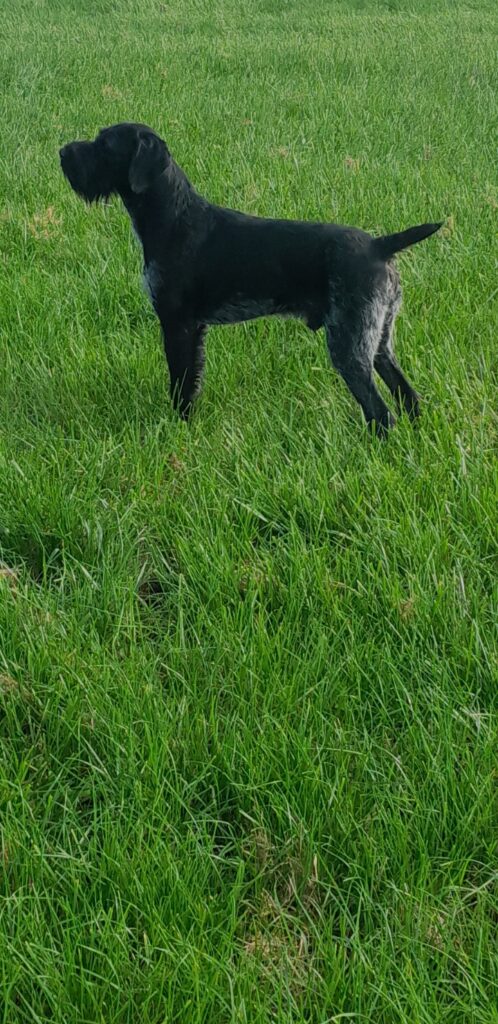 Beschreibung des Hundes: DD Hündin, brsch. 16 Mon. nach der VJP abzugeben. Die Hündin hat eine Grundausbildung, Härtenachweis und VJP mit 74 Pkt. als Suchensiegerin und ist im Apport bereits ausgebildet. Kleine führige und sozialverträgliche Hündin, 57 cm, mit kräftigem Bart.