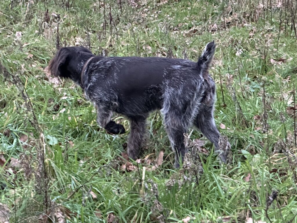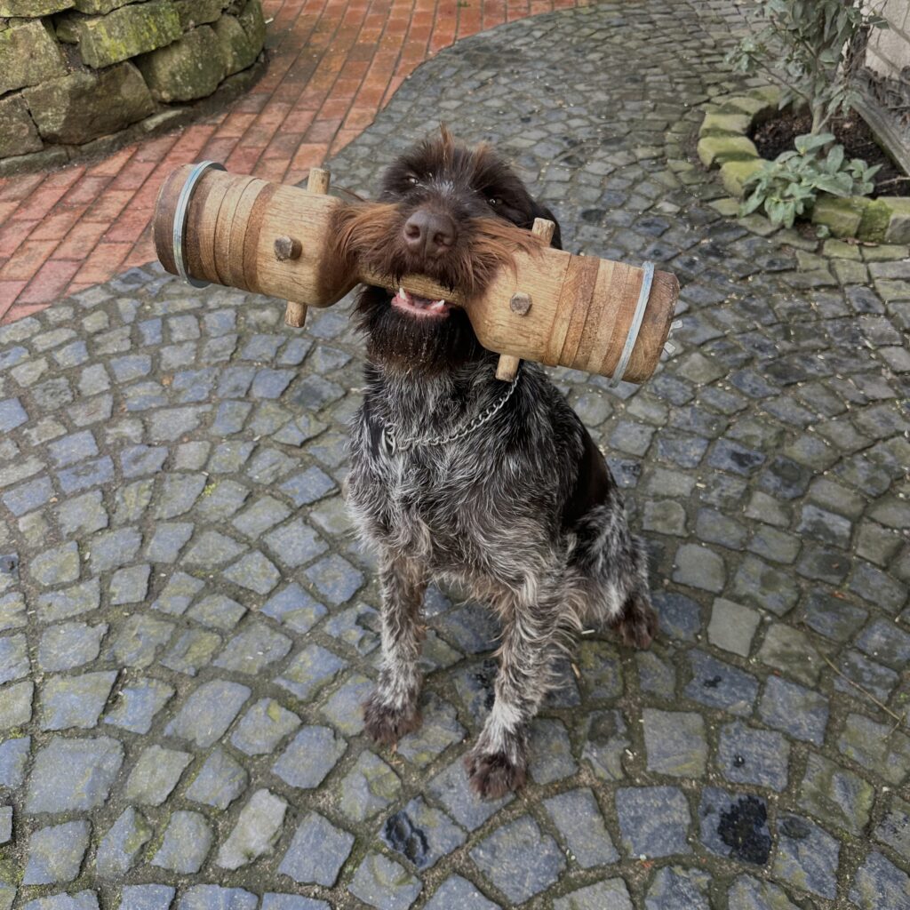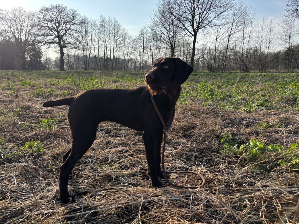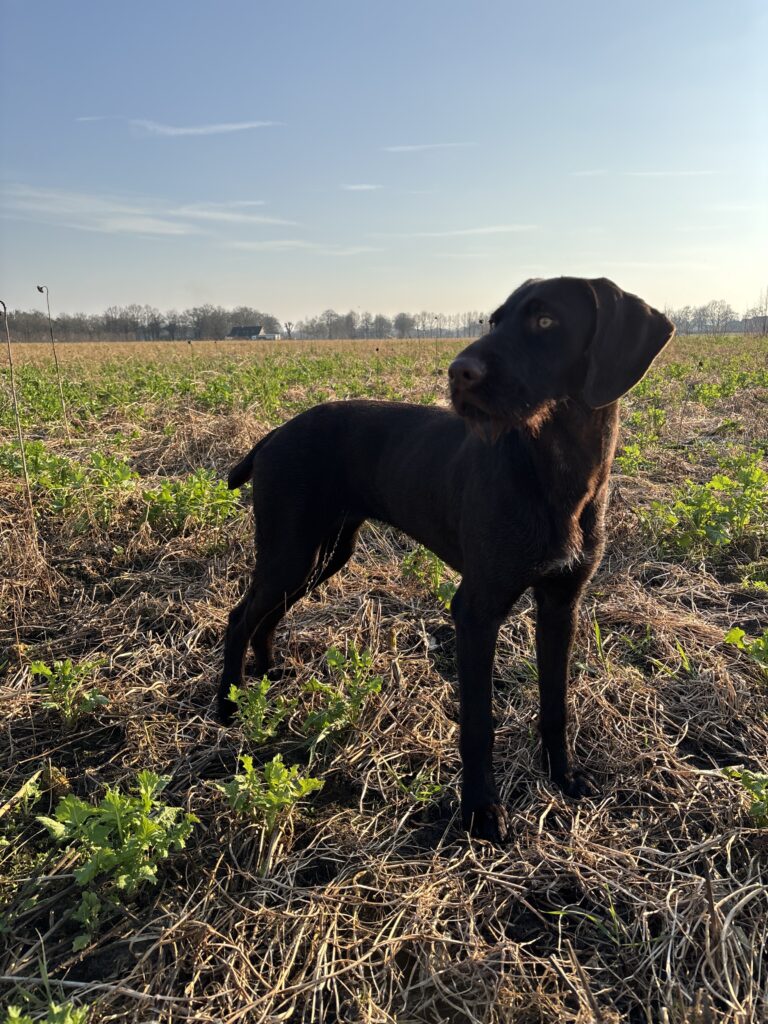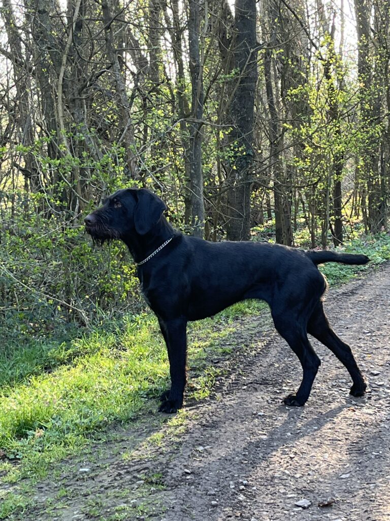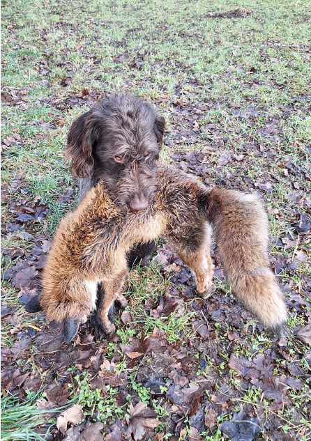 Beschreibung des Hundes: Kessy ist eine Hündin im Mittelschlag mit anliegendem Drahthaar und Jagderfahrung. Sie wurde in dieser Saison von mir auf Niederwildjagden, beim Entenstrich sowie zur Lockjagd (Krähen, Gänse und Kormoran) im eigenen Revier eingesetzt. Dabei ist sie absolut standruhig. Auch auf Drückjagden habe ich sie geführt, sodass sie bereits erste Sauen sprengen konnte. Sie zeigt einen ausgeprägten Finderwillen bei sehr guter Führigkeit. Man merkt, wie sie bei jeder Arbeit an Erfahrung gewinnt. Kessy wird aufgrund eigenen Nachwuchses abgegeben. Sie wurde im Zwinger in Gruppenhaltung mit angeschlossenem Auslauf gehalten. Kessy ist ruhig im Umgang und verträglich mit Artgenossen. Eine Hündin, mit der man in der nächsten Jagdsaison viel Freude haben wird.