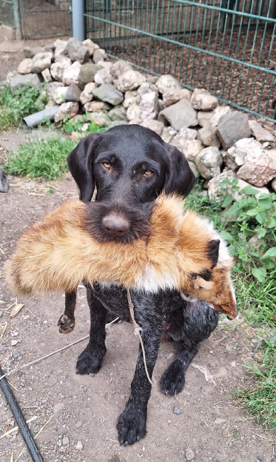 Beschreibung des Hundes: Anis ist eine leichtführige, zuchttaugliche Hündin, die ihrem Führer stets gefallen will. Sehr früh bewies sie ihre Härte am Raubwild, ihre Vostehleistungen, sowie ihre Nase (11) sind besonders hervorzuheben. Sie lebt bei uns im Zwinger mit 4 weiteren Drahthaar, kennt tägliche Autofahrten, das Haus und Kinder. Anis wird aktuell auf die VGP vorbereitet und wird wegen Nachzucht in beste Jägerhände abgegeben.