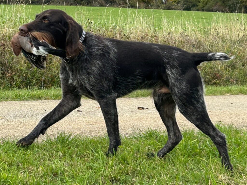 Beschreibung: Schorsch ist ein freundlicher, ausgeglichener Rüde mit einem gefestigten Charakter.Er zeigt eine große Wasserpassion, sehr gute Vorstehmanieren, ebenso hat er eine gesunde Härte. Der Rüde ist auf Treibjagd und Wasserjagd eingesetzt. Schorsch wird im Haus und Zwinger gehalten.