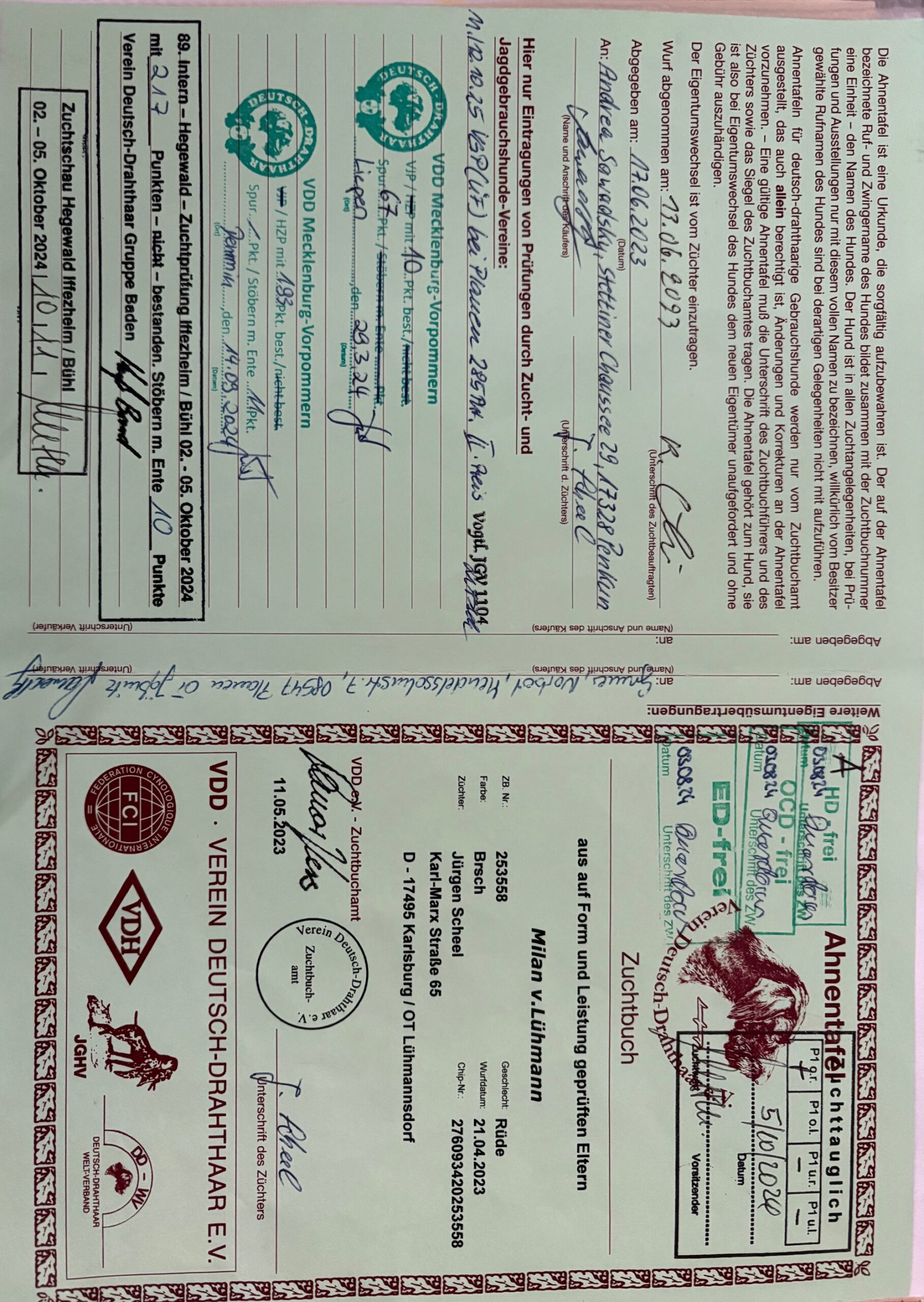 Beschreibung des Hundes: Vino ist ein sehr ansprechende, ruhiger ausgeglichener Rüde des Mittelschlags der sich ruhig und angenehm auf der Jagd verhält. Er ist aber sehr passioniert bei der Arbeit. Er zeigt Ausdauer, Leistung und verliert dabei nicht den Kontakt zum Führer. Er hat seine starken Anlagen an Nase sowie Vorstehen auf VJP, auch am Wasser bei der HZP und Hegewald bestätigt. Auch die Geschwisterleistungen sind ebenso stark in der VJP, HZP und VGP Die Schwester Vera hat ebenfalls erfolgreich die Hegewald mit 237 P, Nase 12- Platz 7 bestanden. Vino lebt mit Familie und Kindern zusammen, und ist Menschen, Artgenossen gegenüber immer freundlich. Der Rüde ist in einem Niederwild Revier im Einsatz.
